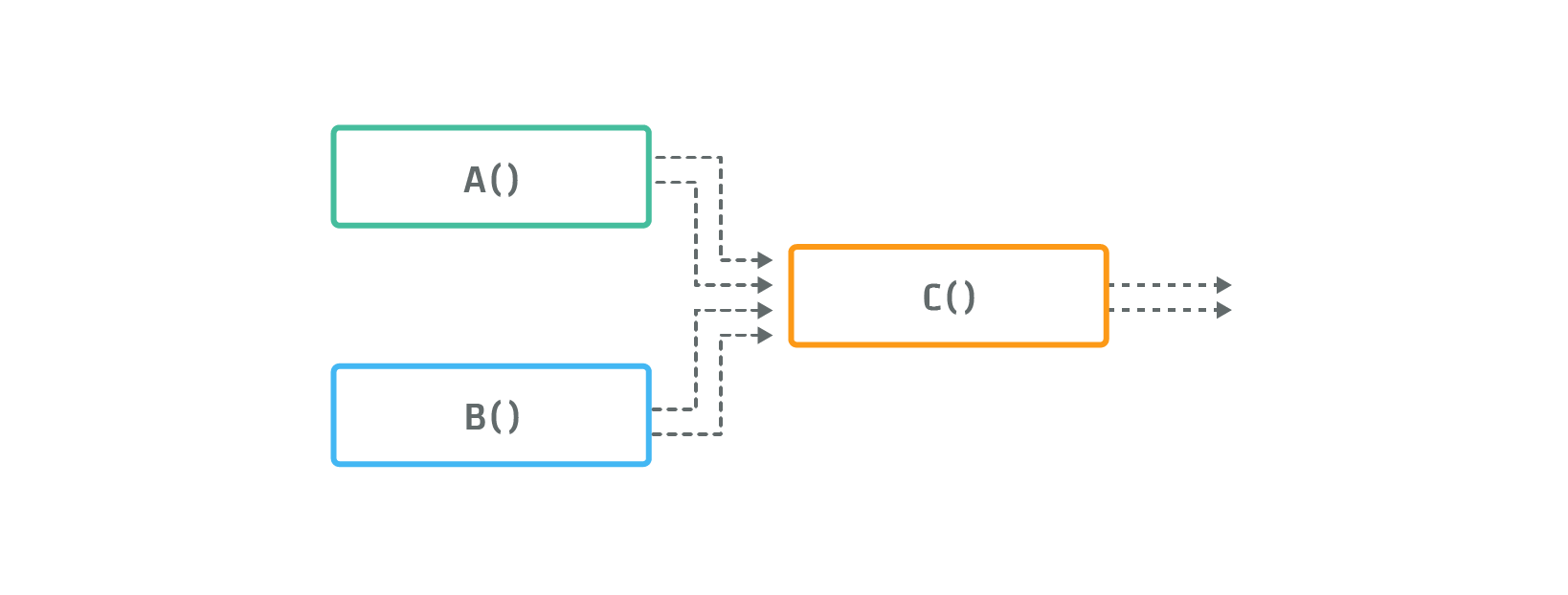 A CAQL statement consists of one or more functions that can be composed in different ways. Functions can have multiple input and output streams. The precise semantics of CAQL functions and streams are will be explained in the following paragraphs.