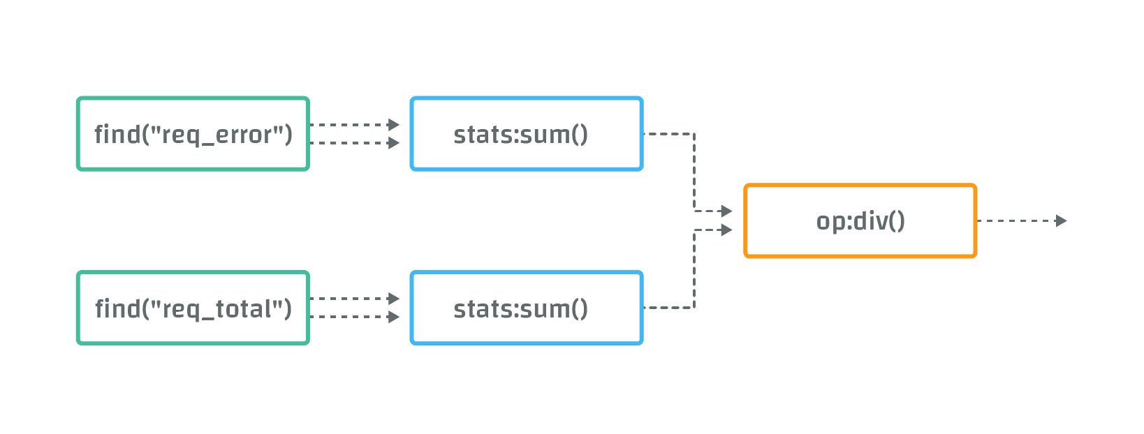 In the first row, the find("req_error") function selects data from all metrics with name "req_error". The resulting streams are "piped" into the stats:sum() function, which sums data from all input streams.